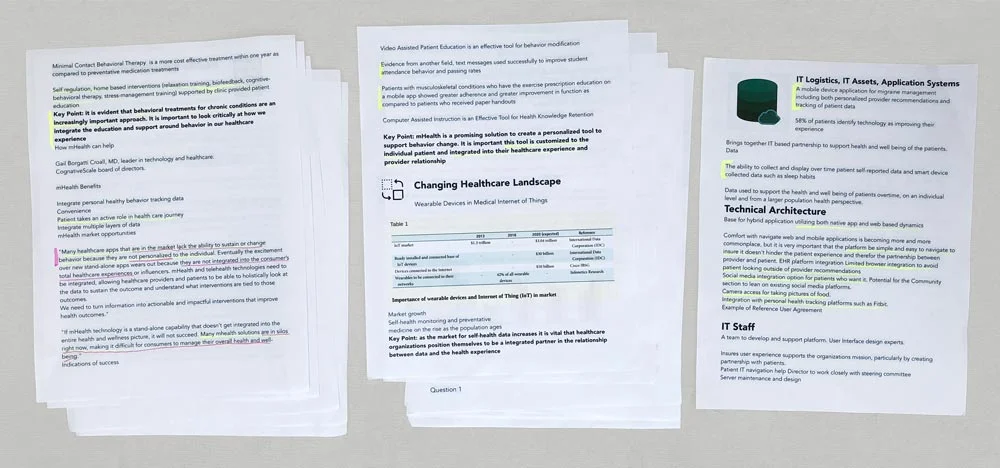 We began with the stakeholder kickoff meeting to identify goals, requirements and constraints. Our client Rowen shared her MindMeister mind map with us, a wealth of information and research, but hard to digest in its sprawled out form. I copied, pasted and roughly formatted her MindMeister mind map into a 32 page document. This made it much easier for our team to read, highlight and refer to throughout our design process.