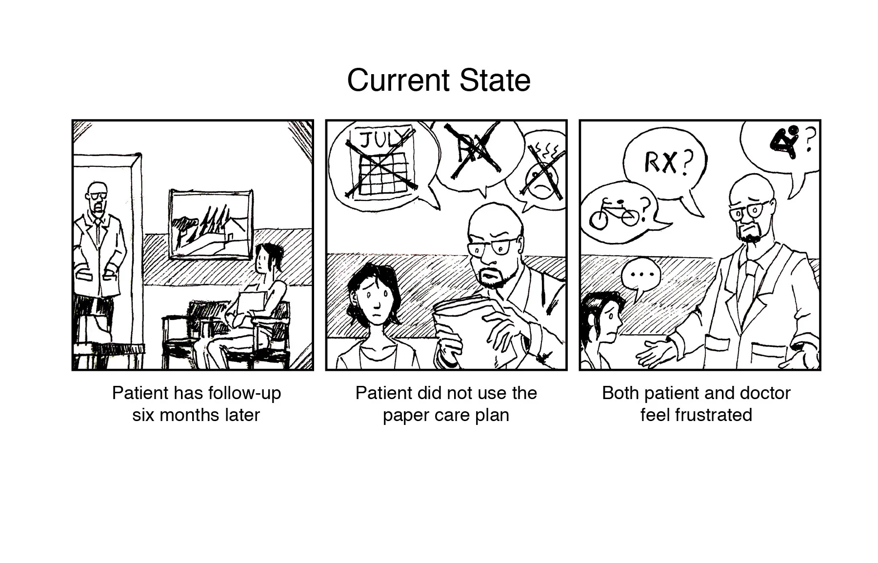 The bottom row depicts an improved provider-patient relationship experience and migraine care plan solution using our app. (Pen and ink storyboards by Phil Howe.)